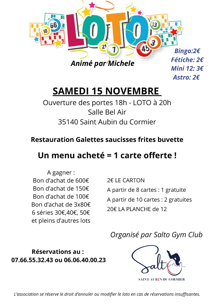 🎉Le grand LOTO du Salto Gym Club à Saint-Aubin-du-Cormier !